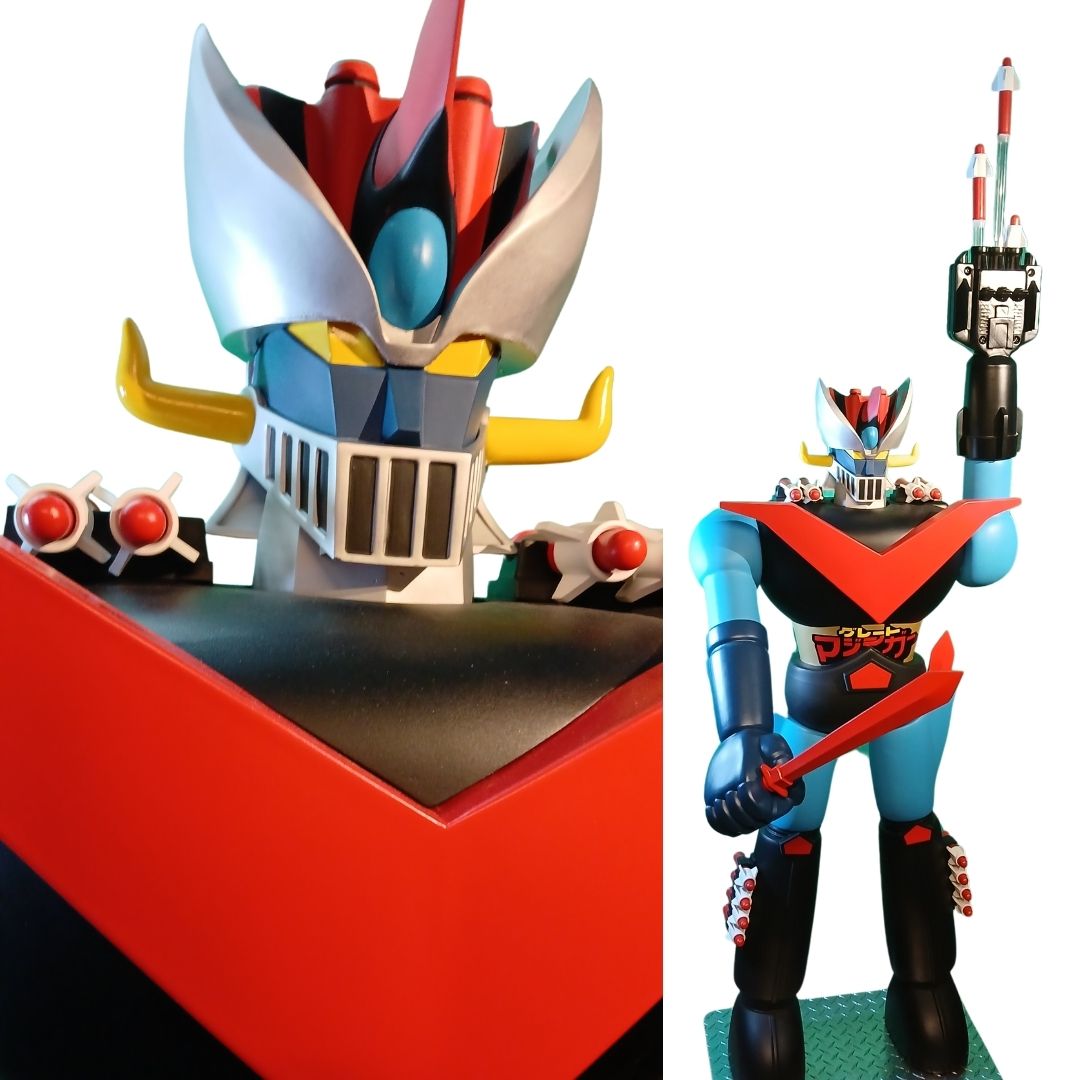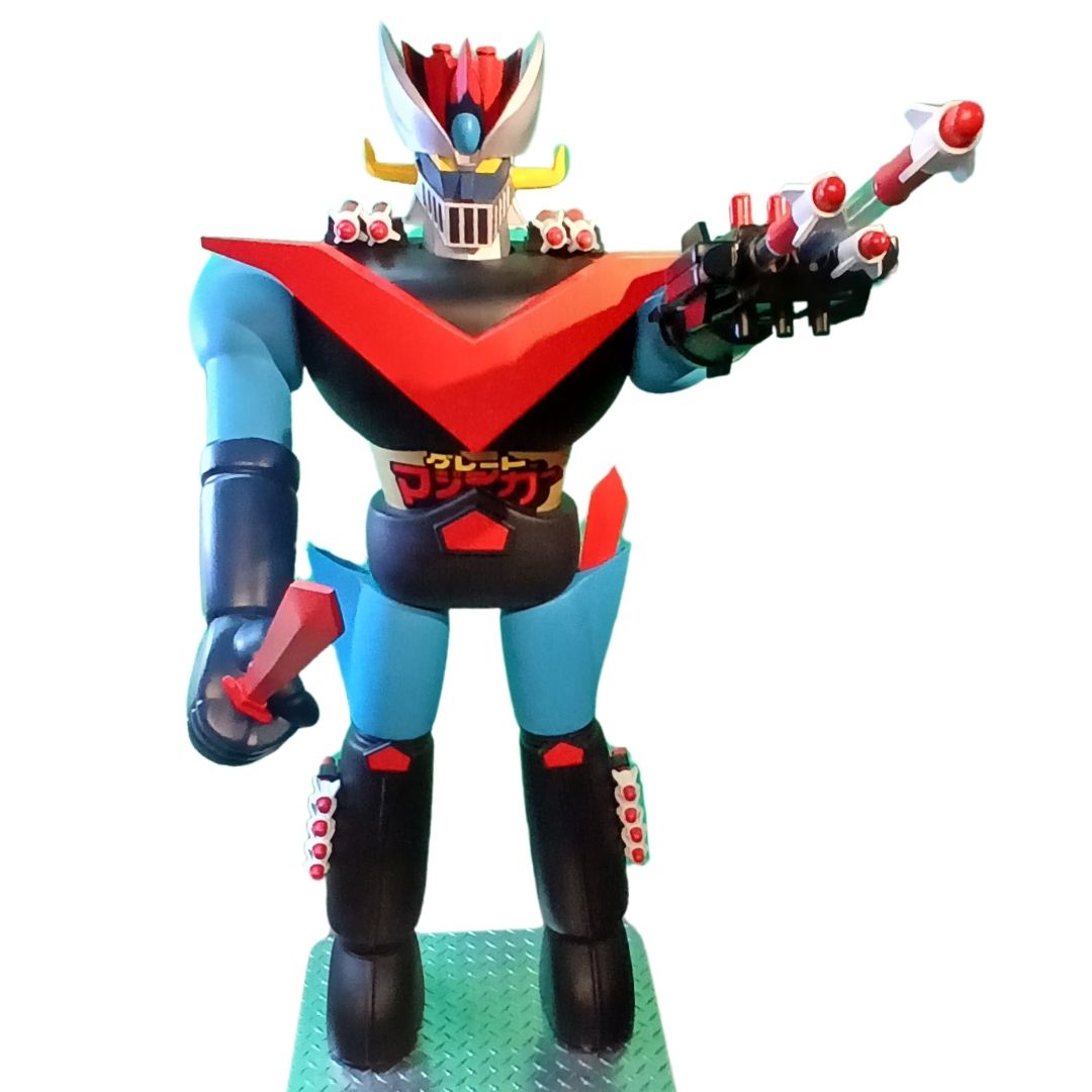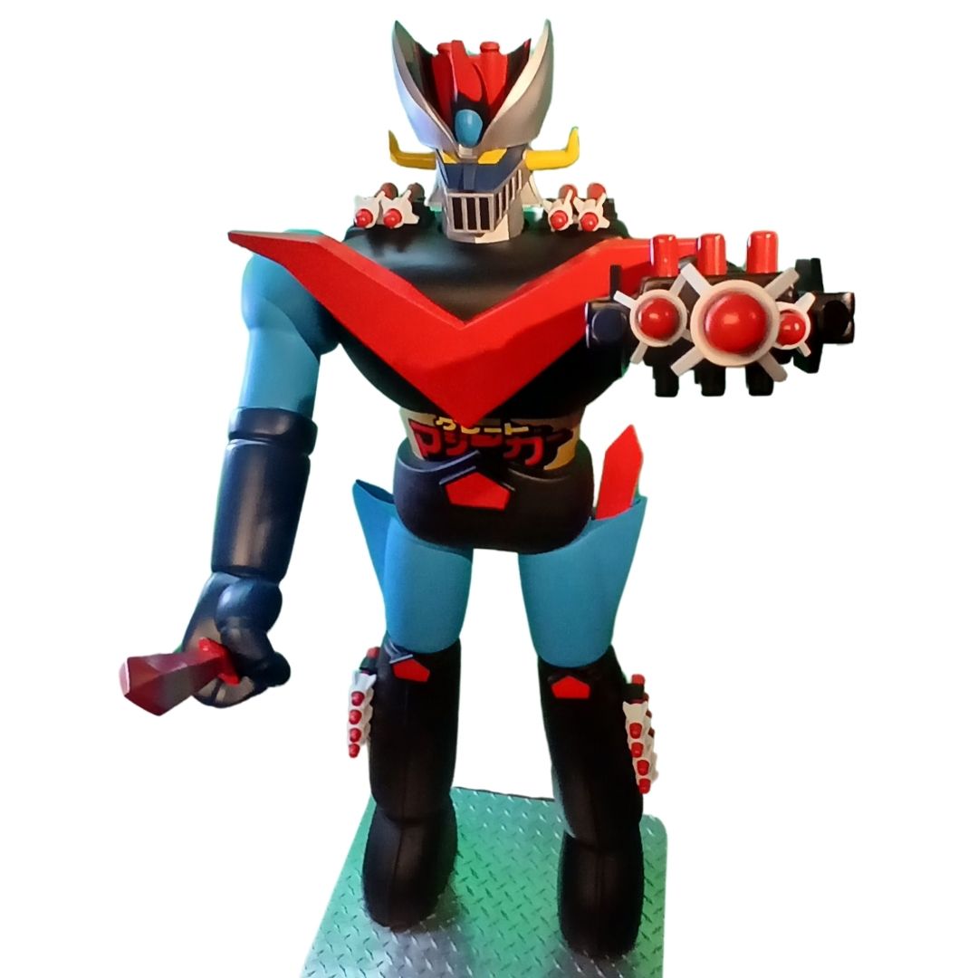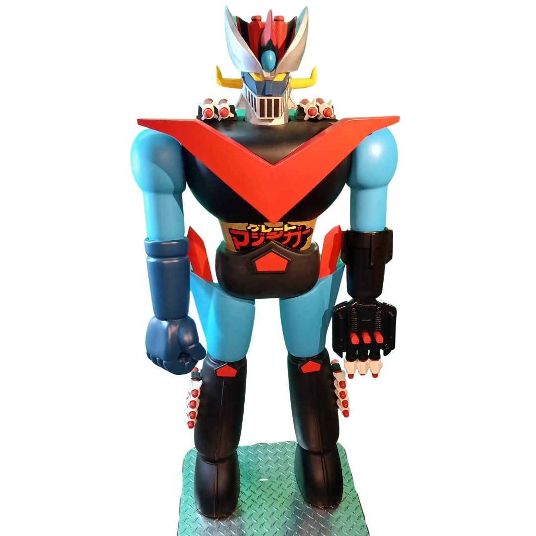 One of a kind 4.5-foot-tall action figure replica statue! Features 6-foot vertical thrust and steel armature supported poses. Stands sentry and in tribute to 24″ vintage robot toy.
